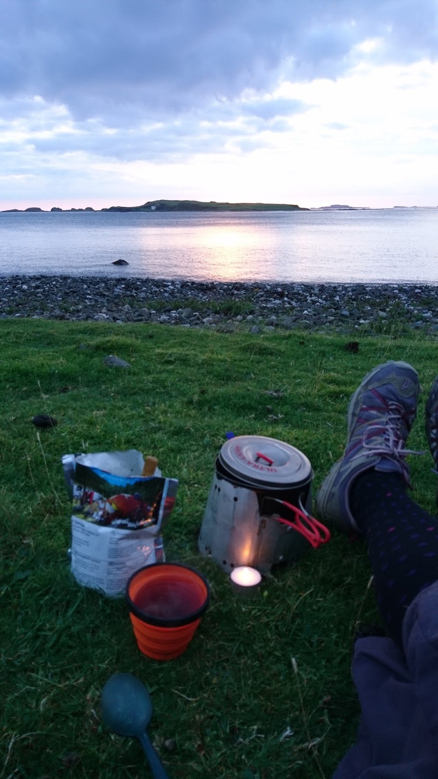 I finally found a good flat pitch by a dinky boathouse, looking up towards the mouth of Loch Moidart. The boathouse gave good windbreaking cover for the meths stove.
